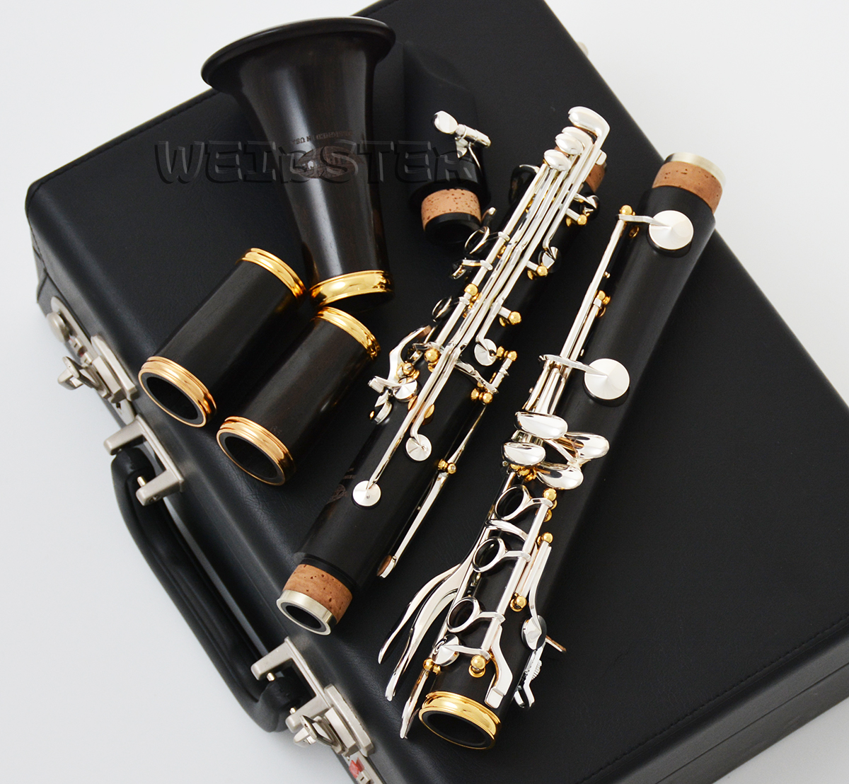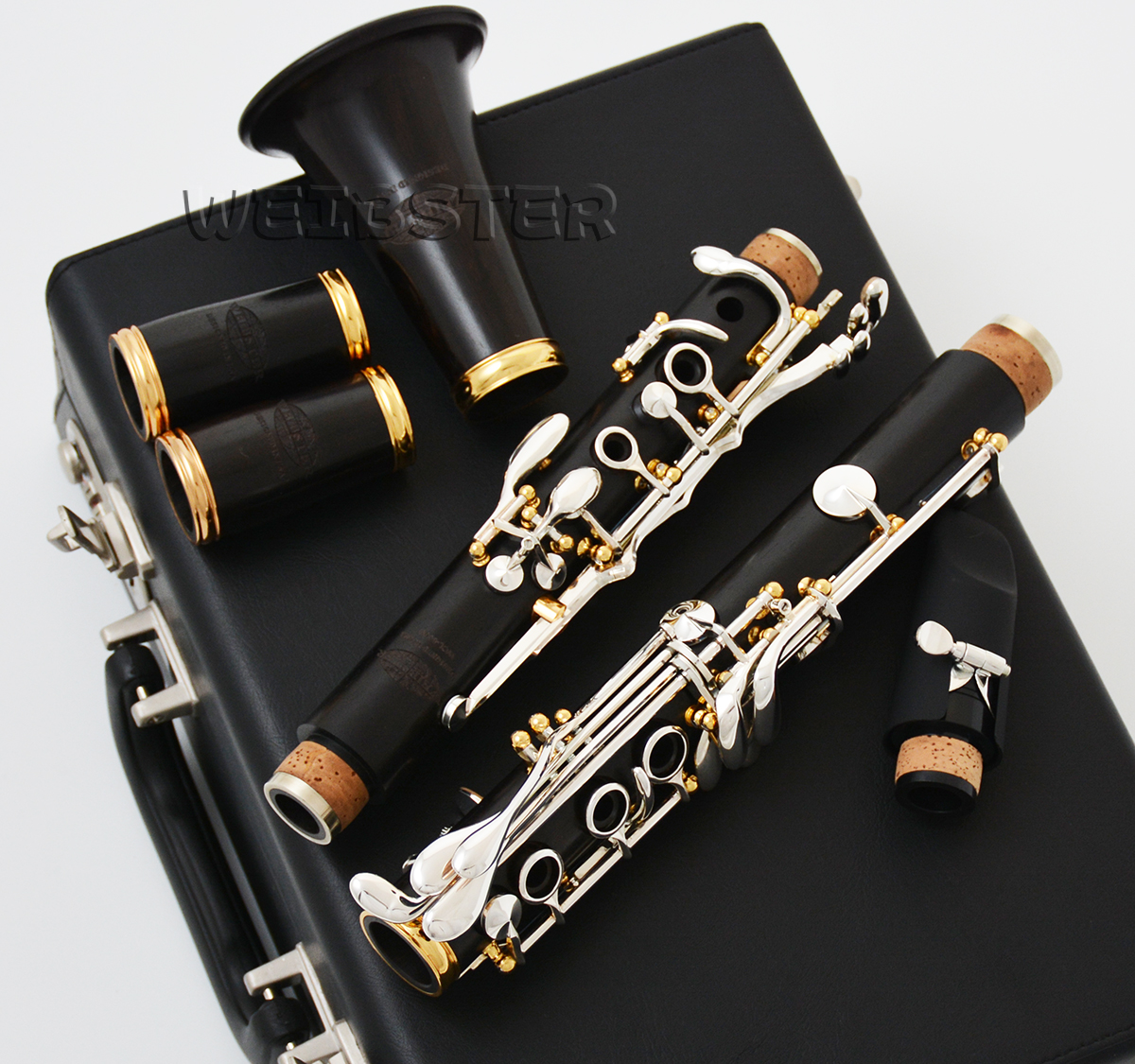 This is a Brand New great looking and sounding USA WEIBSTER Wooden Clarinet , suitable for professional musician for their concert. This well crafted hand made instrument, and made made of African Blackwood that has been processed in special ways, With decades of experience behind the manufacture of this fine instrument, you can be absolutely confident in its performance and durability. The clarinet has a lovely mellow tone, which I am sure will improve over the years. It is a magnificent clarinet. The key work is excellent and it plays quickly and lightly and in tune.