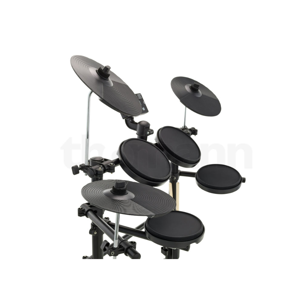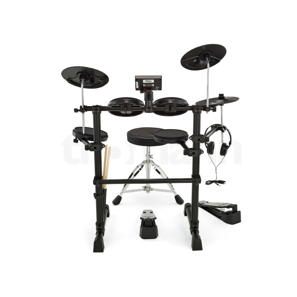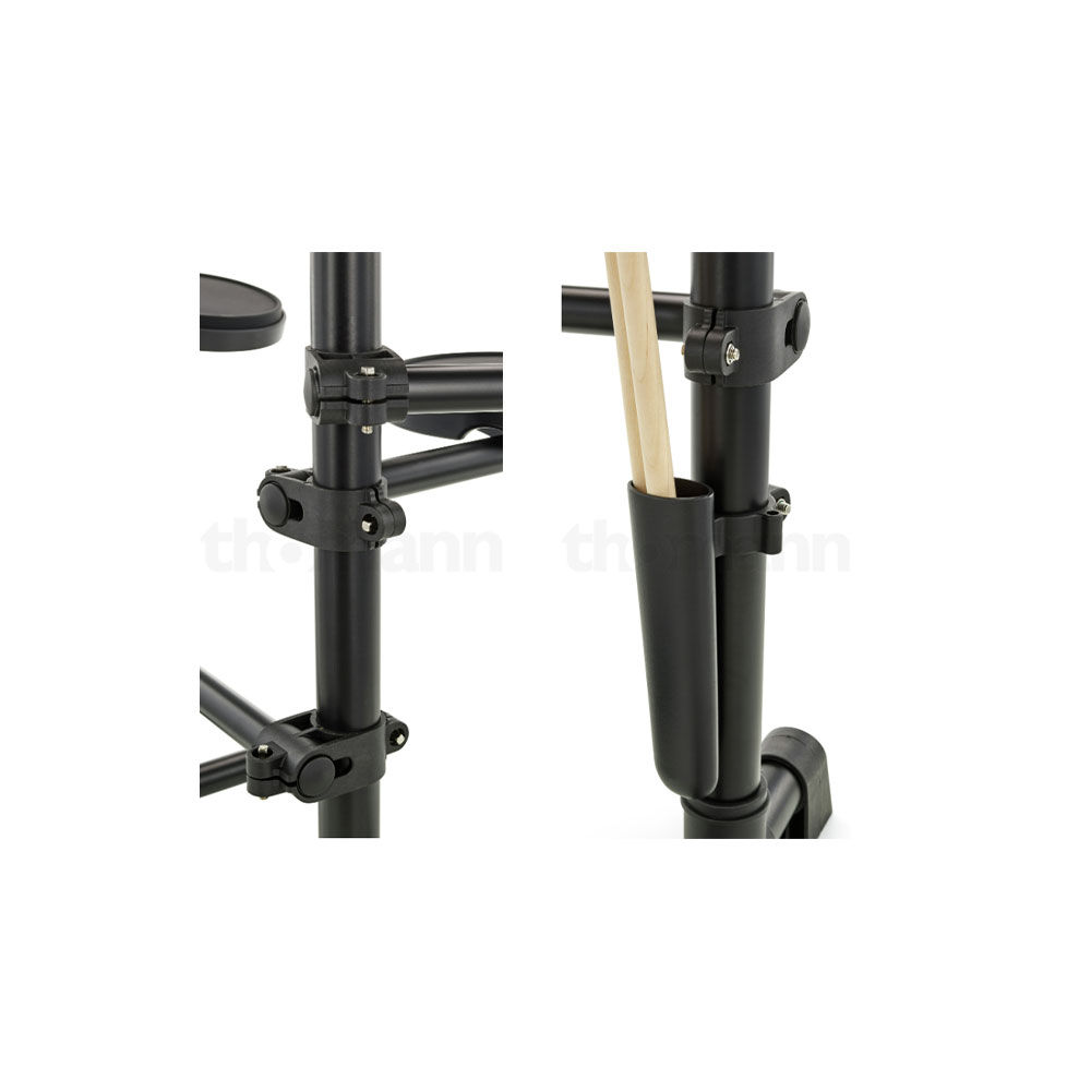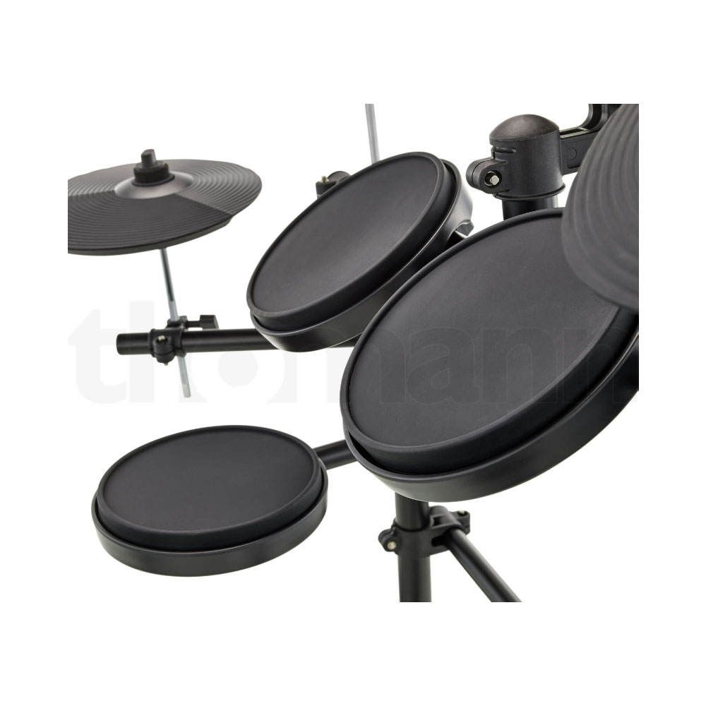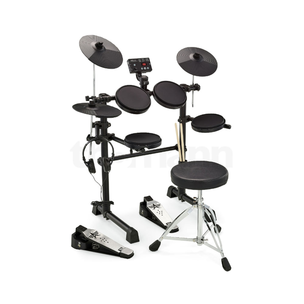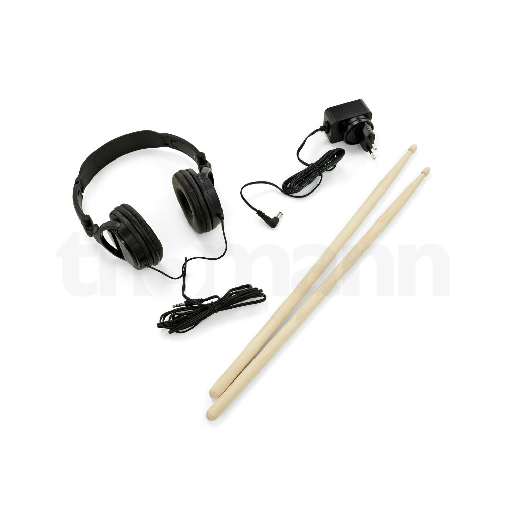 of all ages everything they need to take their first steps on the instrument. Five drum pads with rubber playing surfaces as well as two cymbals