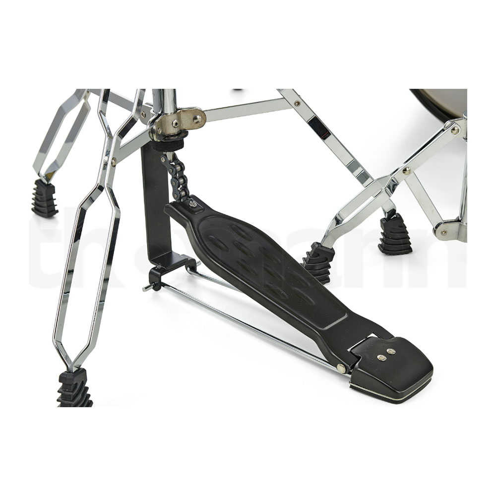 direct power transmission, and a tilt adjustment for the lower hi-hat cymbal. The pedals for the hi-hat and bass drum are made from black anodised